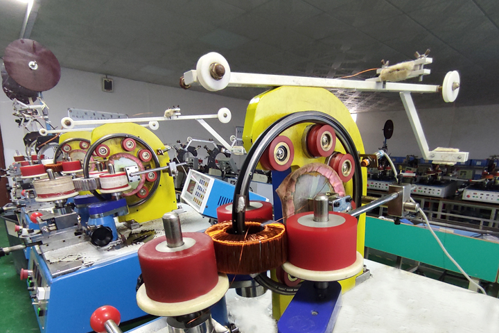 圣元变压器的员工使用绕制机把铜线缓慢均匀地绕制在聚脂薄膜包裹好的铁芯上。